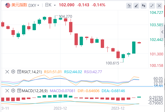 受美债收益率走高支撑,美元指数在2024年第一个交易日大幅攀升。追踪美元兑六种主要货币的ICE美元指数周二飙升0.85%,收报102.24,单日涨幅创数月来最大。