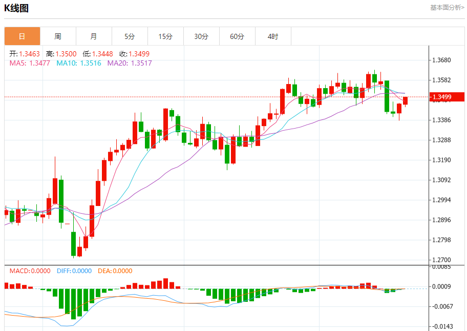 汇价高见1.3500,低见1.3455。上一交易日,汇价收于1.3467。