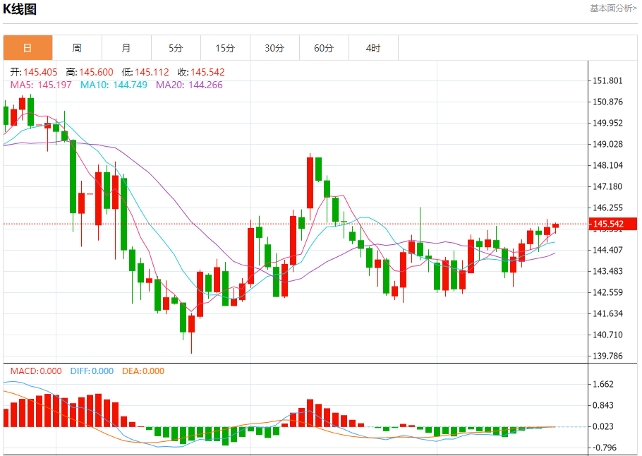 汇价高见145.607,低见145.120。上一交易日,汇价收于145.447。