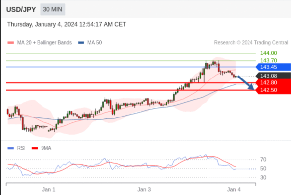 在 143.45 之下,看跌,目标价位为 142.80 ,然后为 142.50 。