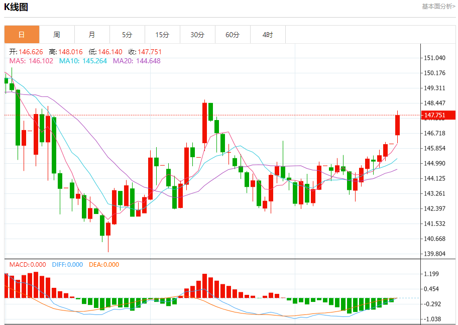汇价高见148.012,低见146.131。上一交易日,汇价收于146.115。