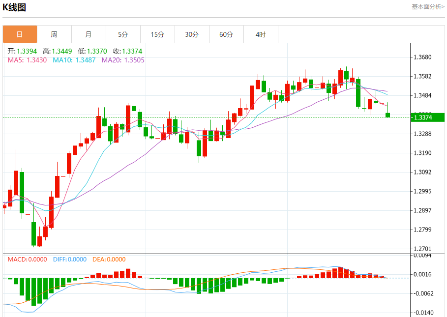 汇价高见1.3448,低见1.3370。上一交易日,汇价收于1.3443。