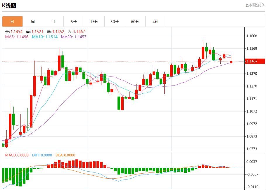 汇价高见1.1520,低见1.1452。上一交易日,汇价收于1.1519。