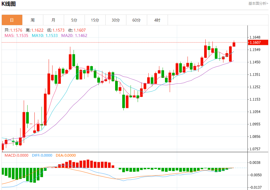 汇价高见1.1622,低见1.1573。上一交易日,汇价收于1.1576。