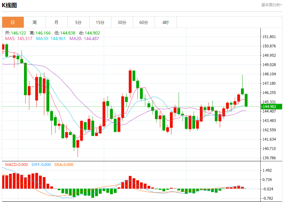 汇价高见146.166,低见144.838。上一交易日,汇价收于146.127。