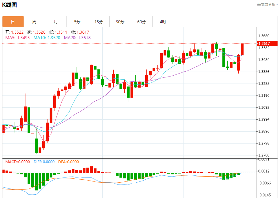 汇价高见1.3626,低见1.3511。上一交易日,汇价收于1.3521。