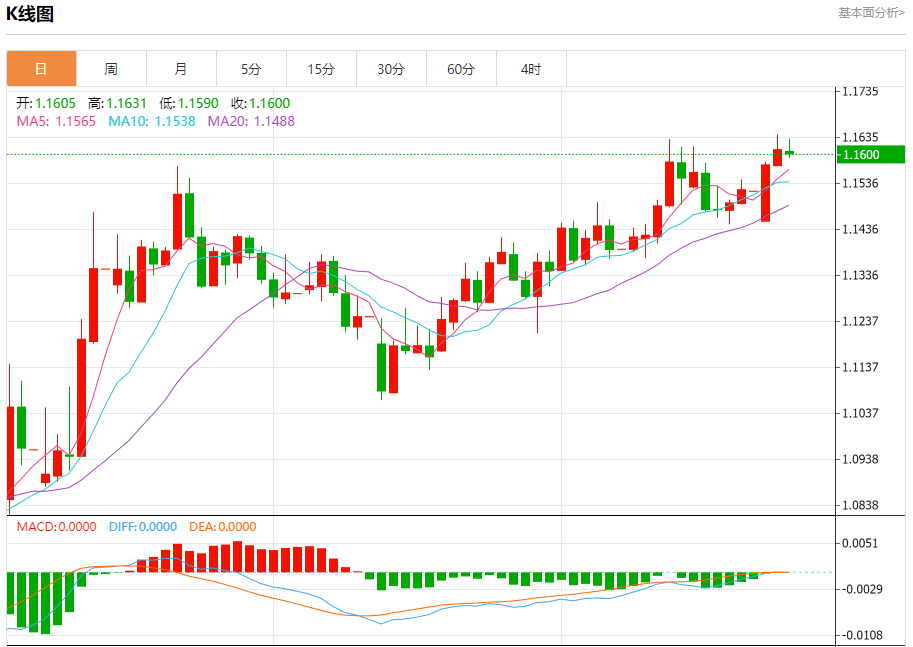 汇价高见1.1631,低见1.1590。上一交易日,汇价收于1.1608。