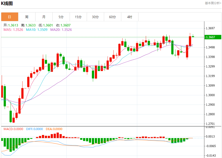汇价高见1.3633,低见1.3601。上一交易日,汇价收于1.3613。