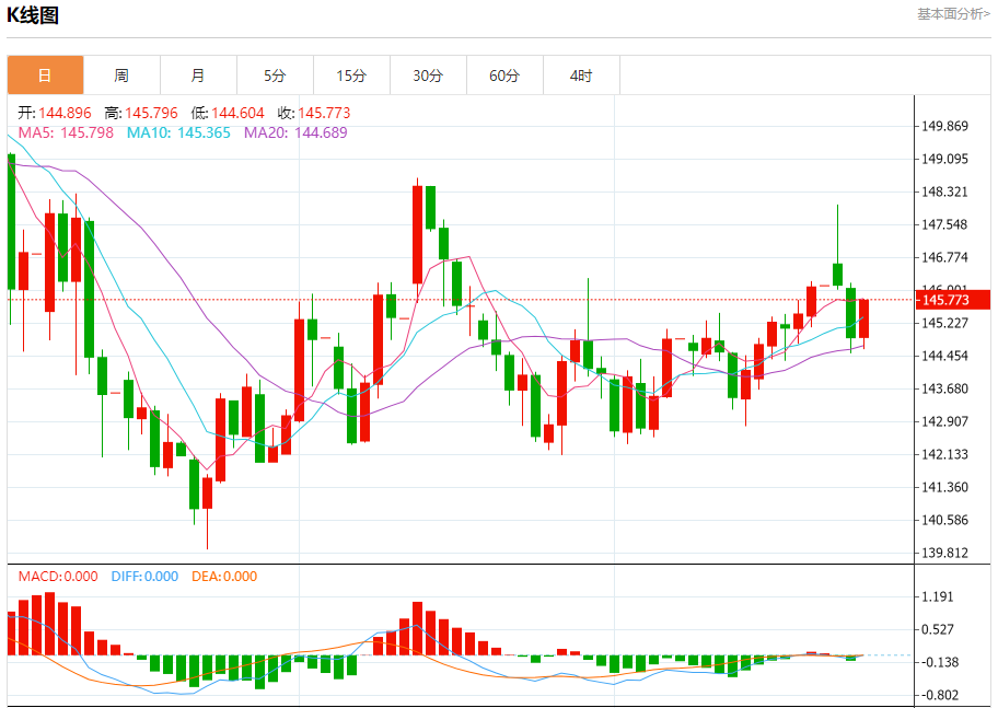 汇价高见145.796,低见144.604。上一交易日,汇价收于144.900。