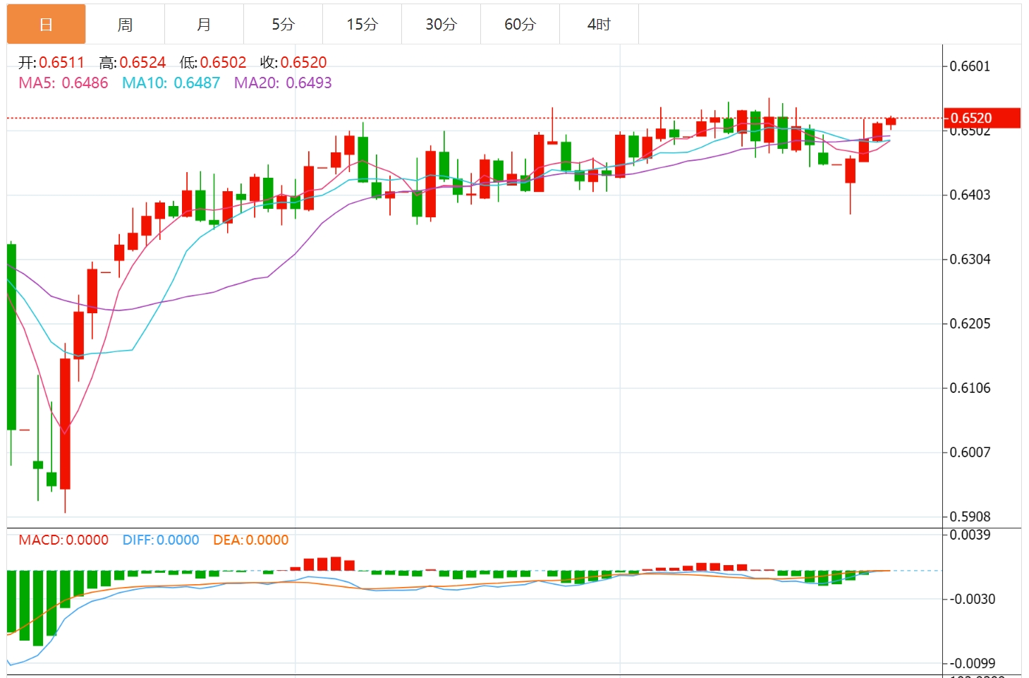 技术分析:澳元在0.6500支撑位上方保持位置,接近九日EMA