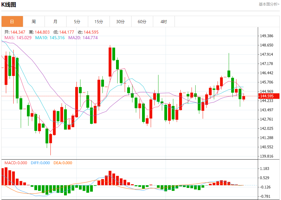 汇价高见144.803,低见144.177。上一交易日,汇价收于144.374。