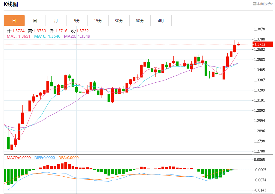 汇价高见1.3750,低见1.3716。上一交易日,汇价收于1.3726。