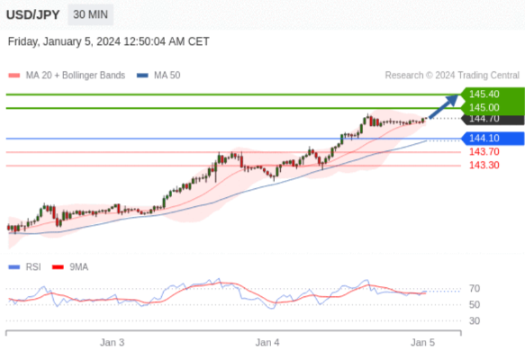 在 144.10 之上,看涨,目标价位为 145.00 ,然后为 145.40 。