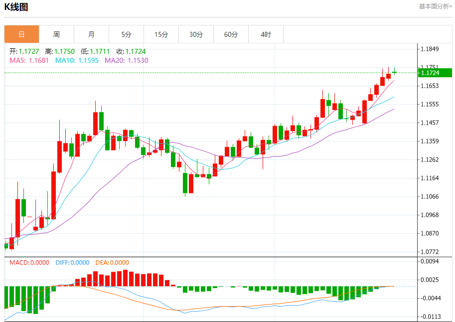 汇价高见1.1750,低见1.1711。上一交易日,汇价收于1.1718。