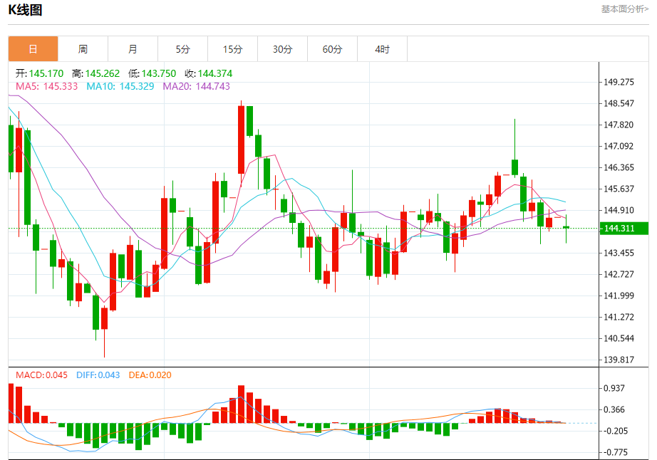 汇价高见144.759,低见143.780。上一交易日,汇价收于144.674。
