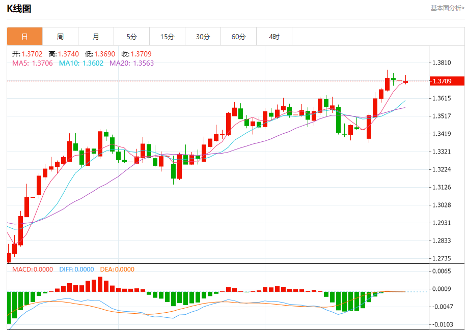 汇价高见1.3740,低见1.3690。上一交易日,汇价收于1.3714。