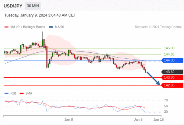 在 144.30 之下,看跌,目标价位为 143.30 ,然后为 142.85 。