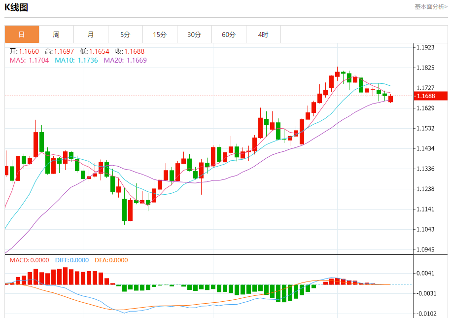 汇价高见1.1697,低见1.1654。上一交易日,汇价收于1.1690。