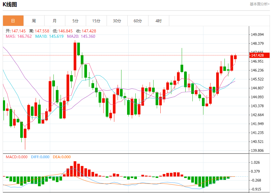 汇价高见147.558,低见146.845。上一交易日,汇价收于147.405。