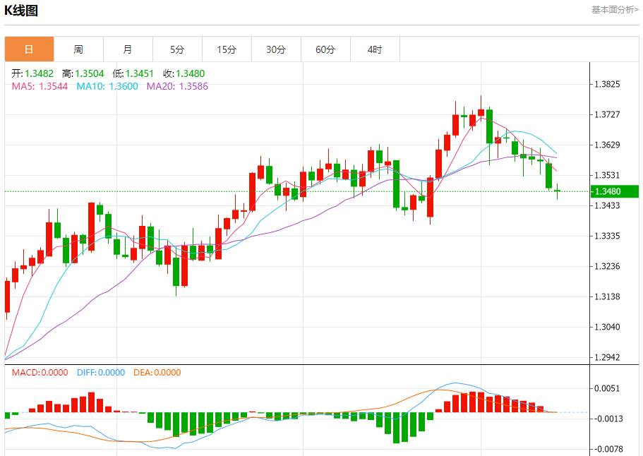 汇价高见1.3504,低见1.3451。上一交易日,汇价收于1.3492。
