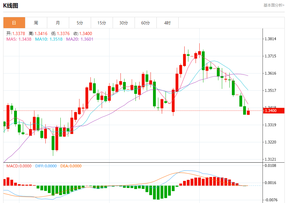 汇价高见1.3416,低见1.3376。上一交易日,汇价收于1.3379。