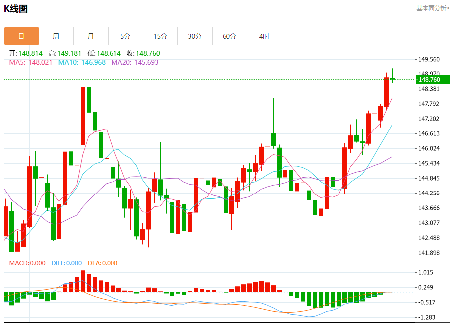 汇价高见149.181,低见148.614。上一交易日,汇价收于148.828。