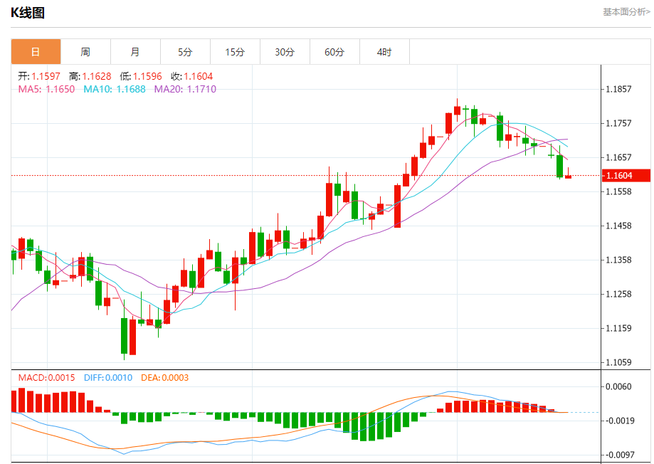 汇价高见1.1628,低见1.1596。上一交易日,汇价收于1.1601。