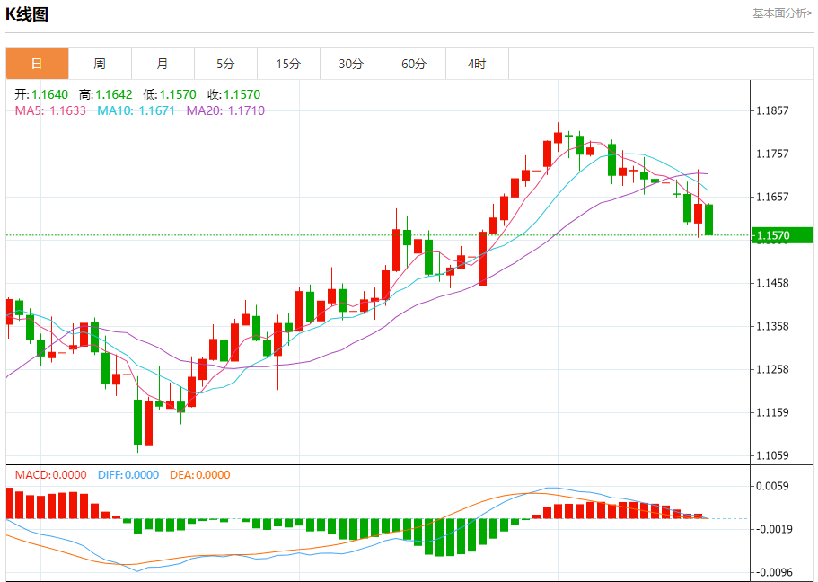 汇价高见1.1642,低见1.1573。上一交易日,汇价收于1.1641。