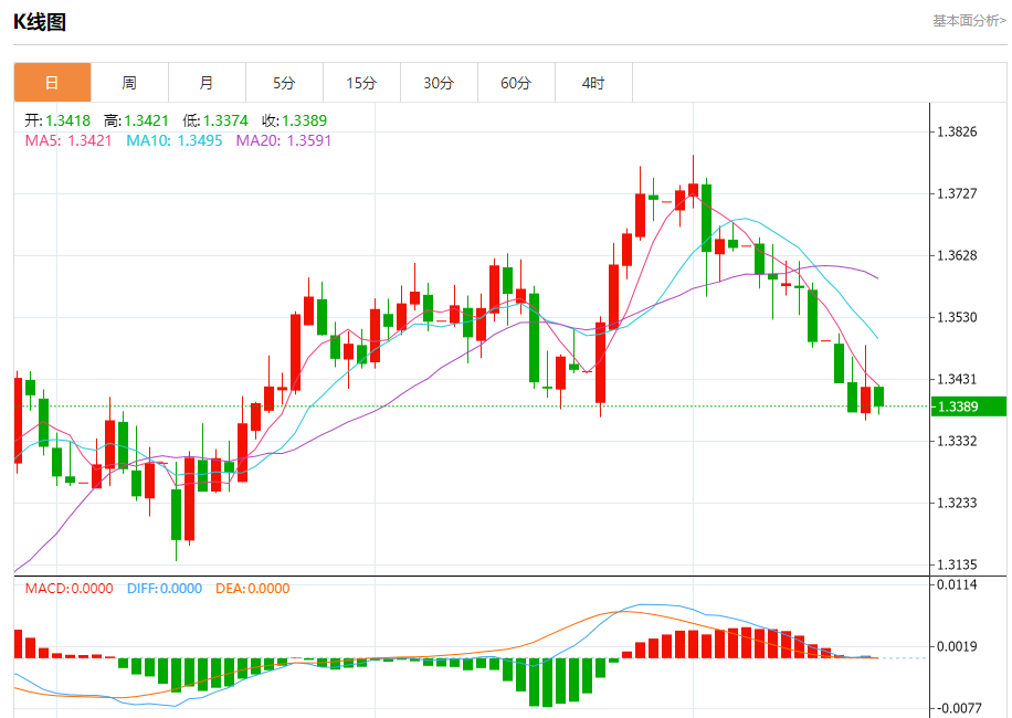 汇价高见1.3424,低见1.3374。上一交易日,汇价收于1.3418。