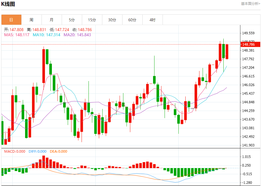 汇价高见148.822,低见147.579。上一交易日,汇价收于147.866。