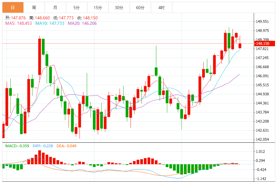 周一(7月21日),美元/日元下跌148.190,暂报148.181,跌幅0.43%。