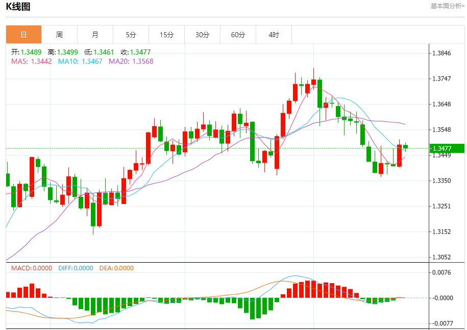 汇价高见1.3499,低见1.3461。上一交易日,汇价收于1.3487。