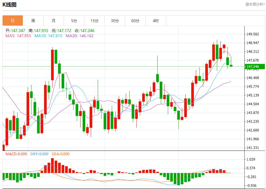汇价高见147.935,低见147.172。上一交易日,汇价收于147.366。