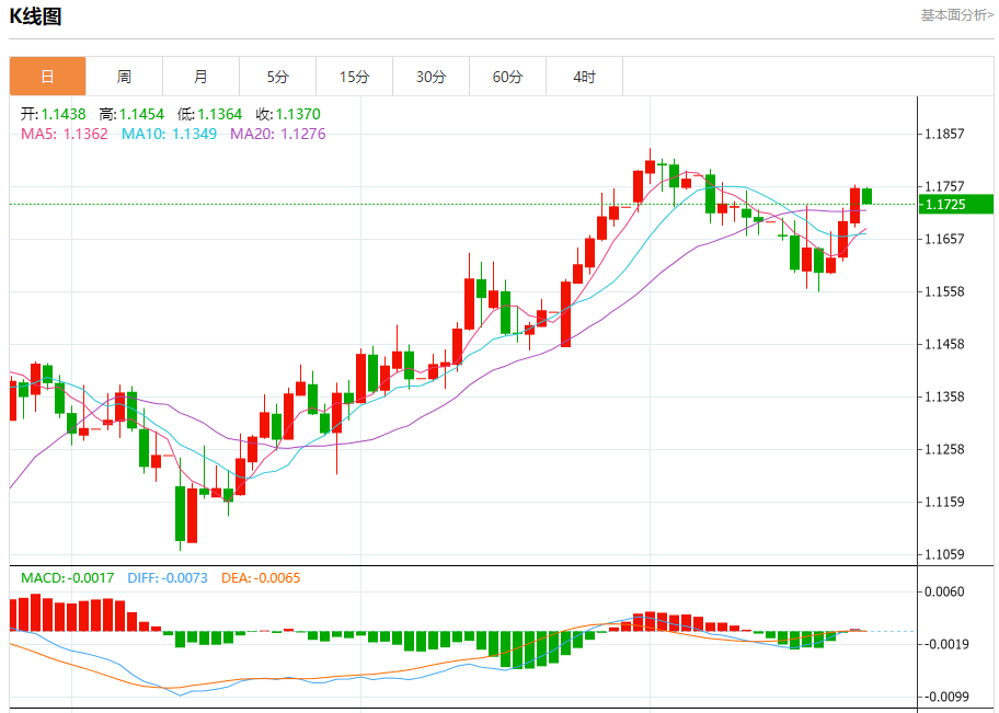 汇价高见1.1755,低见1.1723。上一交易日,汇价收于1.1753。