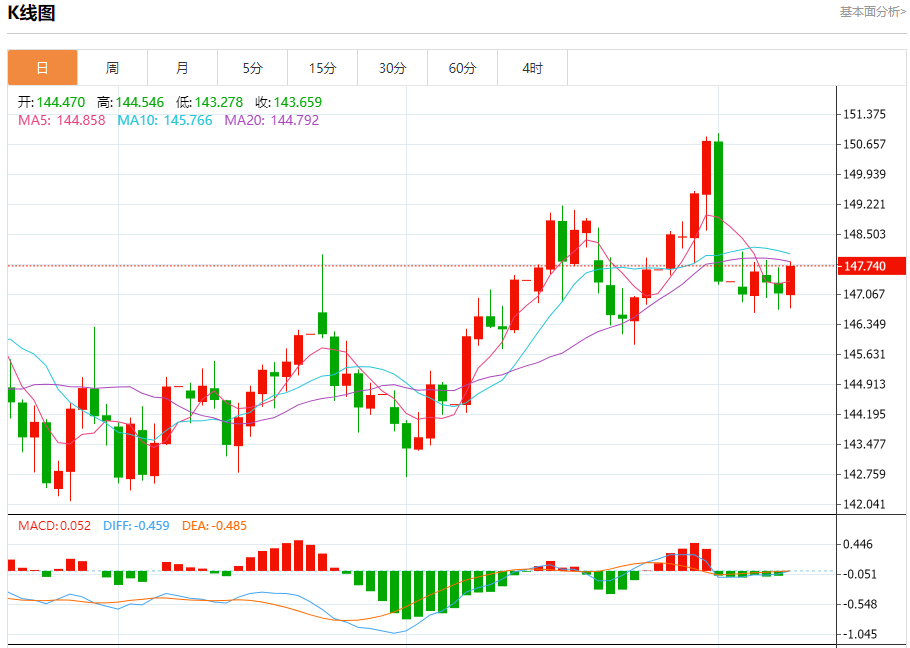汇价高见147.849,低见146.722。上一交易日,汇价收于147.103。