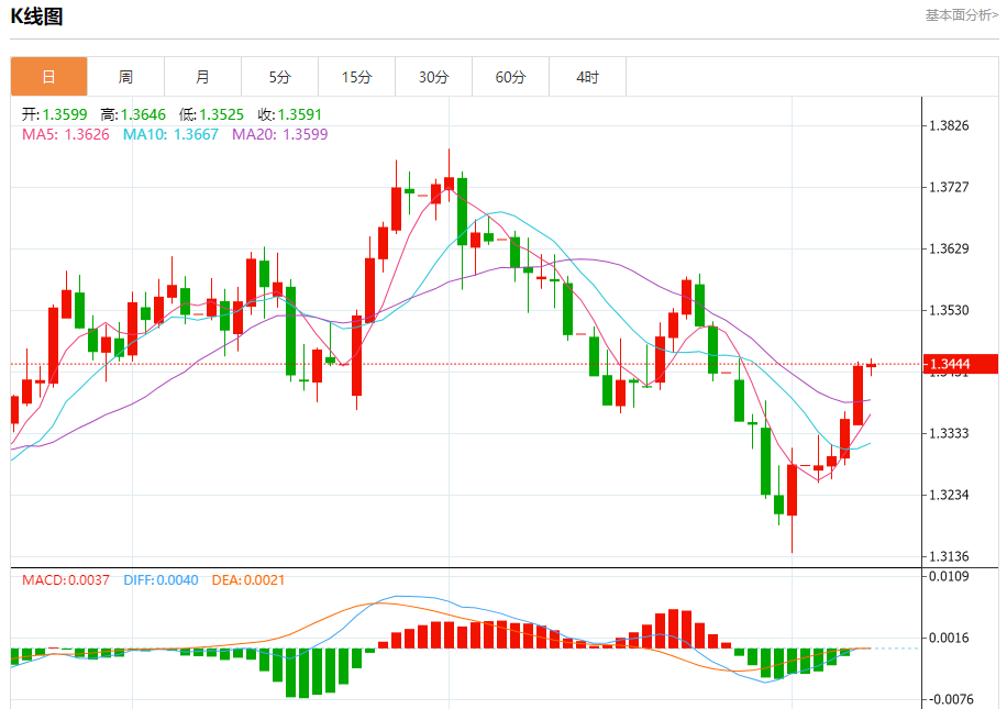 汇价高见1.3453,低见1.3424。上一交易日,汇价收于1.3441。