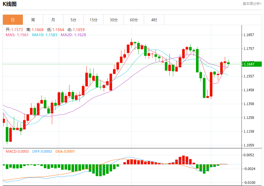 汇价高见1.1679,低见1.1629。上一交易日,汇价收于1.1664。