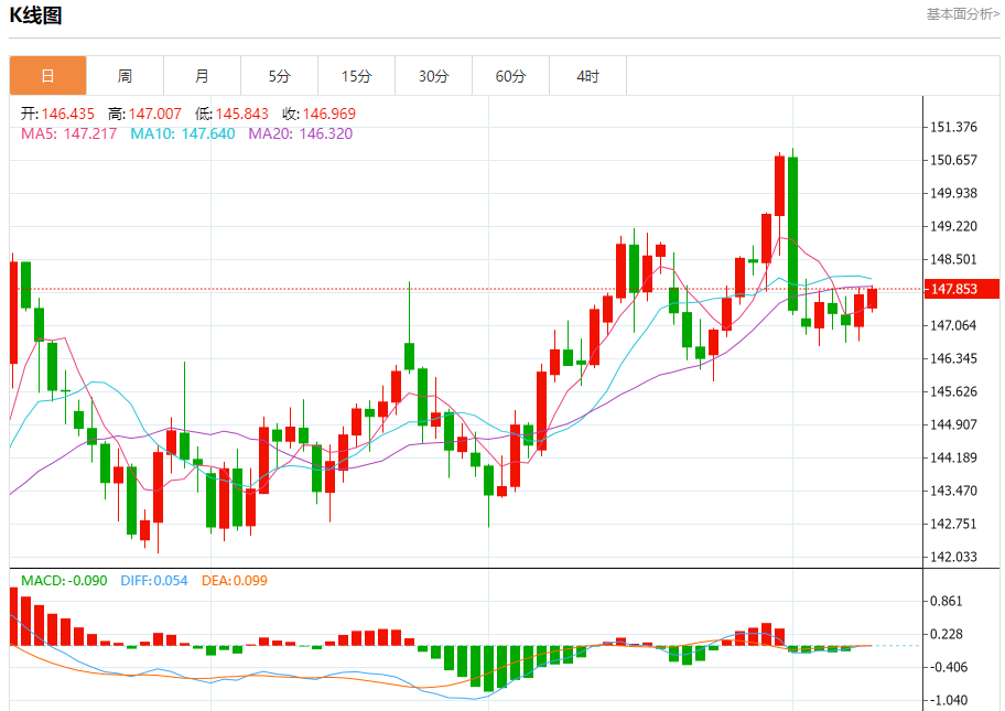 汇价高见147.942,低见147.344。上一交易日,汇价收于147.735。