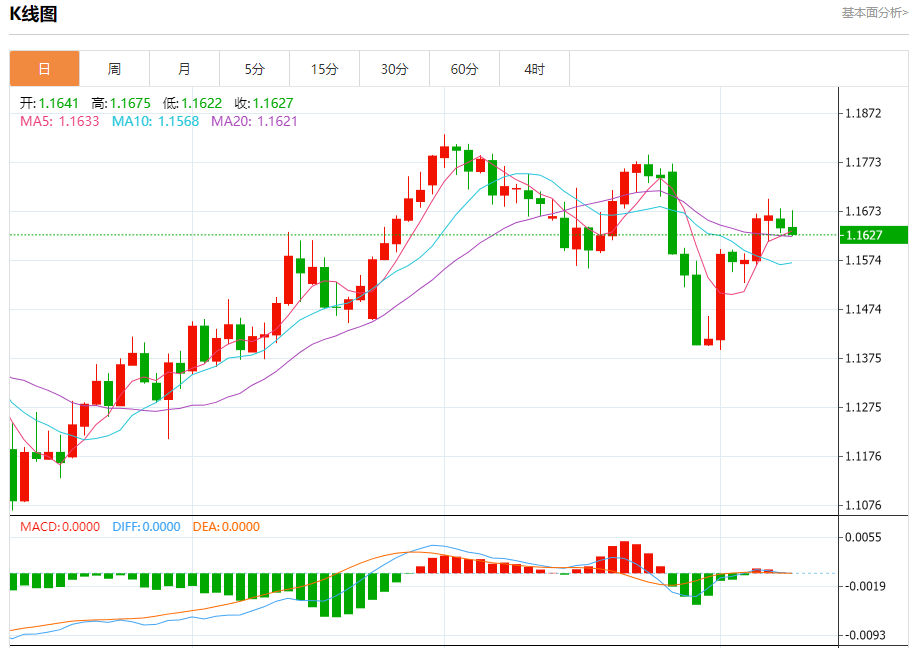 汇价高见1.1675,低见1.1623。上一交易日,汇价收于1.1640。