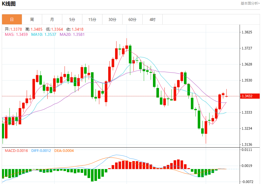 汇价高见1.3476,低见1.3425。上一交易日,汇价收于1.3445。
