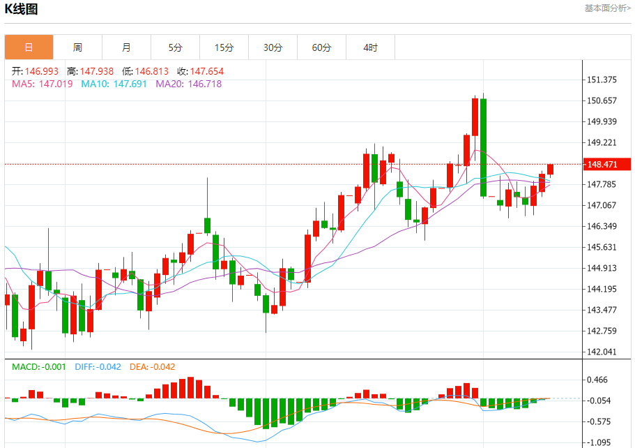 汇价高见148.490,低见147.997。上一交易日,汇价收于148.142。
