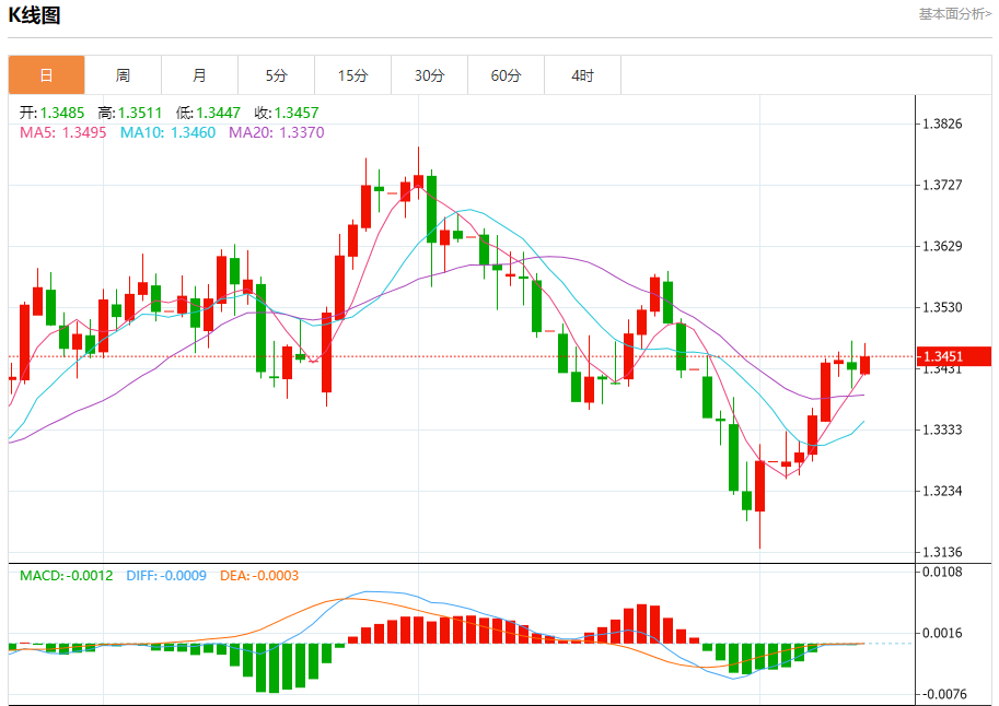 汇价高见1.3472,低见1.3420。上一交易日,汇价收于1.3431。