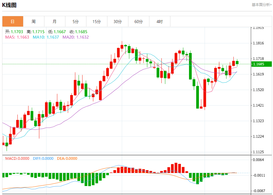 汇价高见1.1715,低见1.1667。上一交易日,汇价收于1.1705。