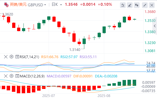 乐观的英国国内生产总值(GDP)报告为英镑提供了一些支持。英国国家统计局(ONS)周四显示,英国经济在2025年第二季度环比增长0.3%,而第一季度增长0.7%。这一数字好于报告期内增长0.1%的预期。按年计算,英国第二季度GDP增长1.2%,而前值为1.3%。该读数高于市场共识1.0%。