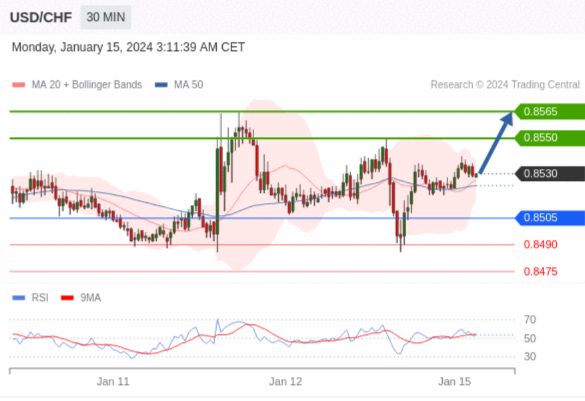 在 0.8505 之上,看涨,目标价位为 0.8550 ,然后为 0.8565 。