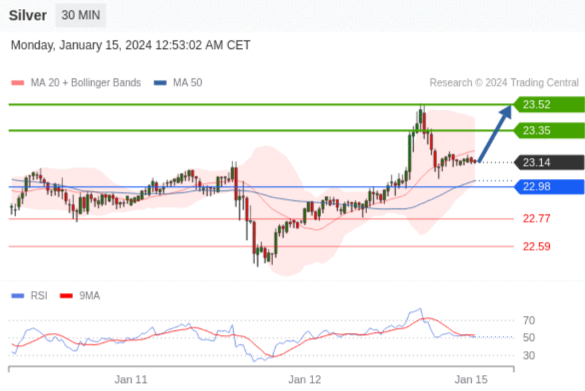 【XM交易平台】2024年1月15日亚盘交易建议:黄金、白银、欧元、英镑、日元、瑞郎交易点位技术分析及预测