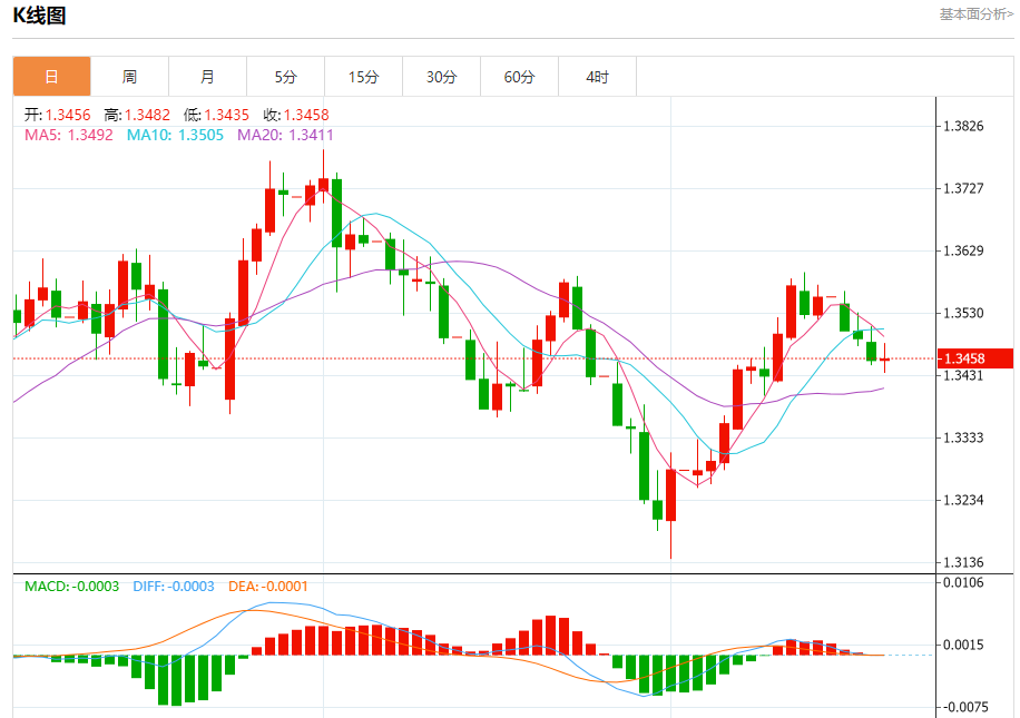 汇价高见1.3482,低见1.3435。上一交易日,汇价收于1.3455。