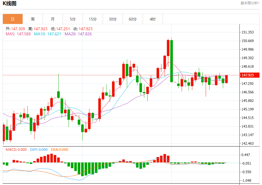 汇价高见147.912,低见147.128。上一交易日,汇价收于147.308。