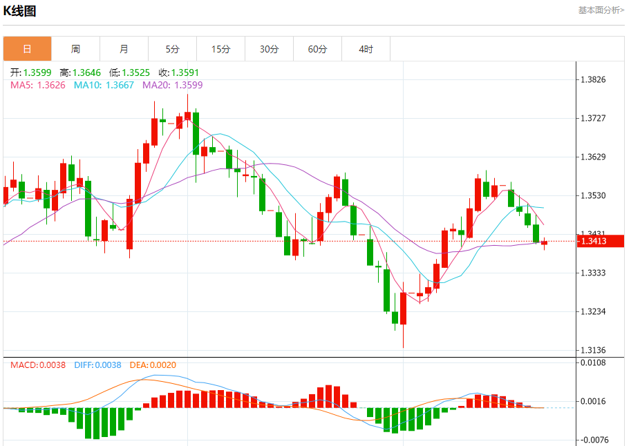 汇价高见1.3423,低见1.3390。上一交易日,汇价收于1.3412。