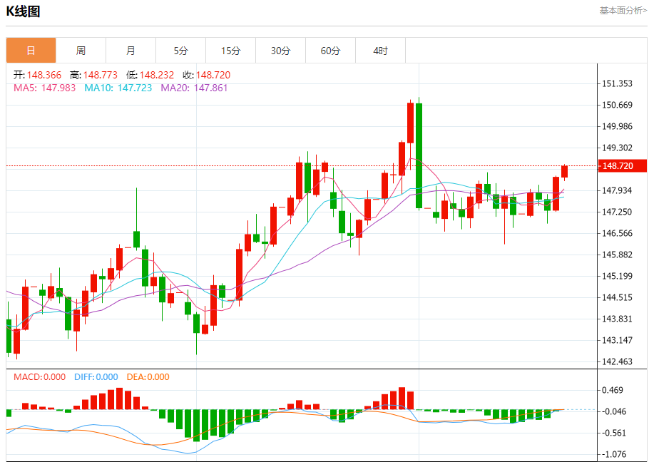 汇价高见148.773,低见148.232。上一交易日,汇价收于148.363。